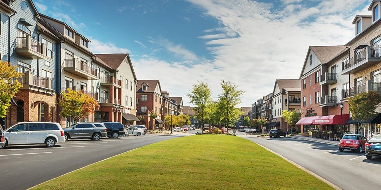 The town square vertically integrates retail and residential in a main street configuration where structure parking is wrapped with three- and four-story buildings. The main street focus allows for pedestrian-friendly, tree-lined streetscapes that evoke a small town atmosphere.